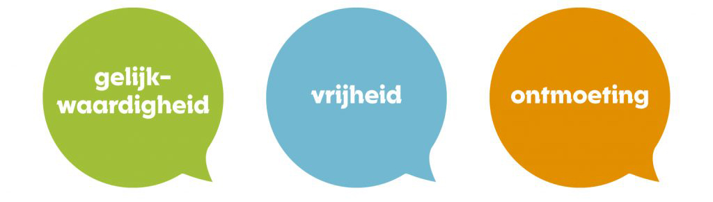 Gelijkwaardigheid, vrijheid en ontmoeting zijn waarden waar we in het openbaar onderwijs voor staan. Zij bieden richting bij het maken van keuzes over onderwijs, samenwerking en hoe we met elkaar omgaan. Je kunt ze gebruiken als toetssteen of kompas en je bij alles wat je doet afvragen: Past dit wel bij onze waarden? Draagt het bij aan onze fundamentele opdracht richting de samenleving? Het zijn ook waarden waarop we elkaar kunnen aanspreken en waarop we aangesproken mogen worden.